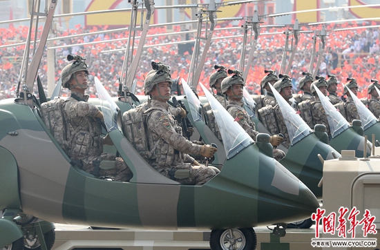 10月1日,慶祝中華人民共和國成立70周年大會上,裝備方隊(duì)官兵身著新式迷彩服接受檢閱。中國青年報(bào)·中國青年網(wǎng)記者 趙迪/攝
