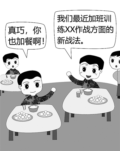 ????“真巧,你也來(lái)加餐啊?!薄笆前?,我們營(yíng)最近在研訓(xùn)新戰(zhàn)法,有時(shí)會(huì)加班訓(xùn)練……我跟你說(shuō),我們研究的新戰(zhàn)法主要是××作戰(zhàn)方面,據(jù)說(shuō)要在全旅推廣呢!”