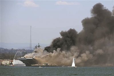 ????發(fā)生火災后,處于撲救滅火狀態(tài)的“好人理查德”號兩棲攻擊艦。