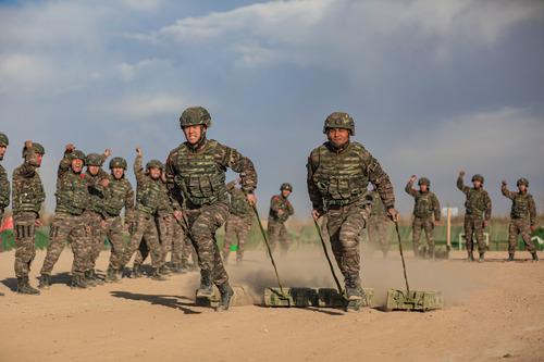 ????武警新疆總隊(duì)某機(jī)動(dòng)支隊(duì)特戰(zhàn)一中隊(duì)組織官兵進(jìn)行搬運(yùn)子彈箱體能訓(xùn)練(10月30日攝)。新華社發(fā)(張文 攝)