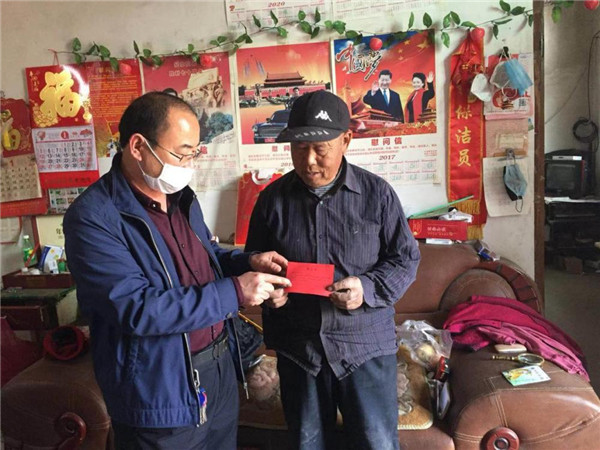 ????費(fèi)縣胡陽(yáng)鎮(zhèn)退役軍人服務(wù)站站長(zhǎng)張中方為優(yōu)撫對(duì)象送光榮單。李永臣 攝