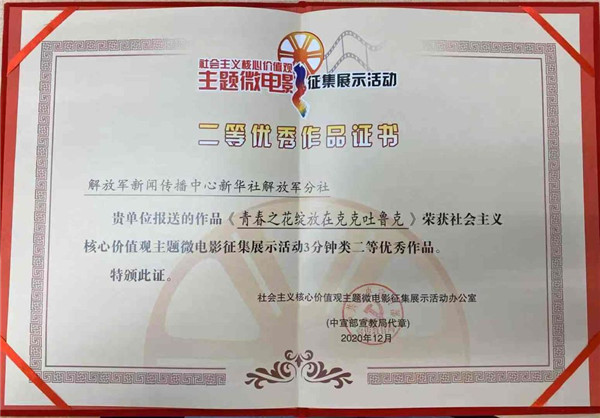 ????活動自2020年5月開展以來,共收到社會各方面報送的作品4354部。征集工作結束后,由相關領域?qū)<覍W者組成的評審組對征集到的作品進行評審,評選出優(yōu)秀作品134部、優(yōu)秀單項5個、優(yōu)秀組織單位12個。其中,由解放軍新聞傳播中心新華社解放軍分社申報的《青春之花綻放在克克吐魯克》獲“3分鐘類優(yōu)秀作品二等獎”。