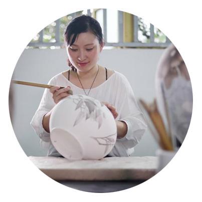 我從小就很喜歡繪畫,大學的時候認識了我的先生,他帶我去了醴陵。當時我看到幾個小女孩拿毛筆在瓶子上細細地勾線,我很喜歡她們這種狀態(tài),想著自己也可以嘗試一下。父親也很鼓勵我,想讓我從事這方面的工作,所以常常帶我去寫生,慢慢地我就愛上了這門技藝。我們醴陵瓷傳統(tǒng)的核心工藝是分水,父親在傳統(tǒng)工藝中總結出“薄施淡染”技法,主要表現(xiàn)對象是花卉,它能使花卉層次更加豐富、水靈通透,體現(xiàn)醴陵瓷清雅淡逸、意態(tài)高潔的陶瓷語言,所以我們現(xiàn)在的創(chuàng)作仍然以花卉為主,而這次在清華的學習,讓我拓寬了許多思路,我想在山水和其他物象中嘗試去用我們工藝來表現(xiàn),希望今后能給觀者帶來一些新的感受。