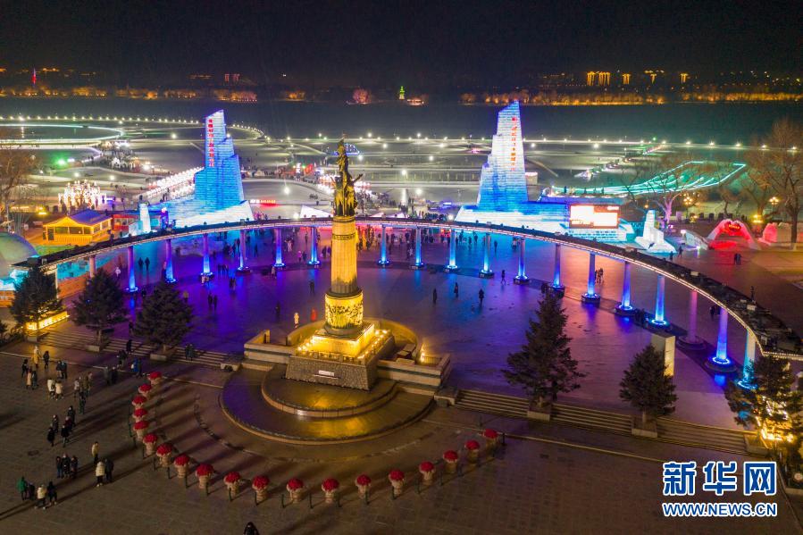 這是2021年1月1日拍攝的防洪紀(jì)念塔及哈爾濱松花江冰雪嘉年華(無(wú)人機(jī)照片)。