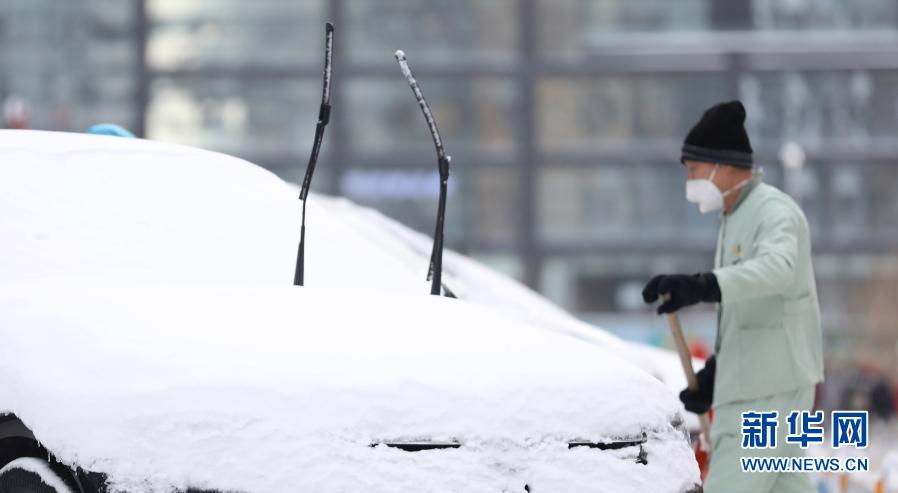 1月28日,在沈陽市渾南區(qū),一名工作人員清掃停車場積雪。