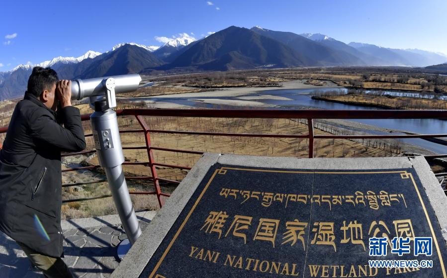 一名游客借助望遠鏡觀看西藏雅尼國家濕地公園的景色(2月2日攝)。
