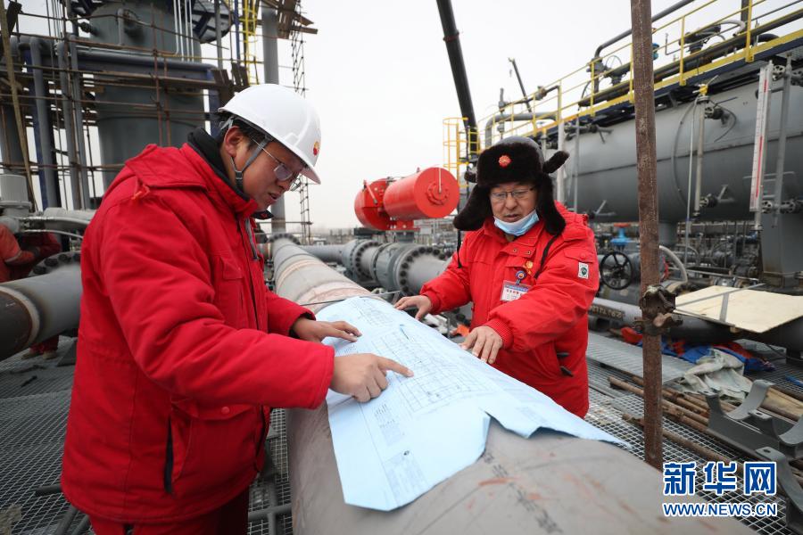 2月3日,在遼河油田雙臺子儲氣庫群一期工程現場,來自湖北孝感的工程技術人員劉單明(左)和同事在現場工作。今年他留在施工現場過年,確保工期目標如期完成。
