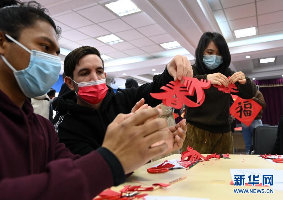2月4日,外國留學(xué)生學(xué)剪“春”字窗花。