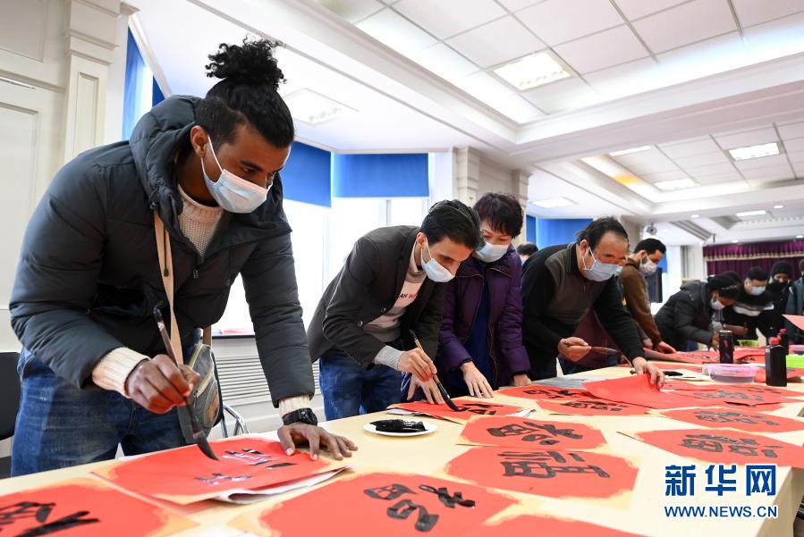 2月4日,外國留學(xué)生在學(xué)寫福字。