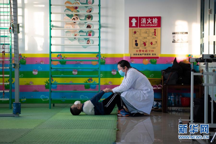 在哈爾濱博能中醫(yī)門診部,劉雨晴為腦癱兒童進(jìn)行康復(fù)訓(xùn)練(2月2日攝)。