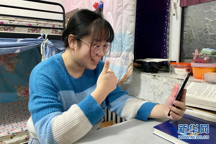 2月10日,在哈爾濱市平房區(qū)的宿舍里,劉雨晴在線上指導(dǎo)腦癱兒童進(jìn)行康復(fù)訓(xùn)練(手機(jī)照片)。