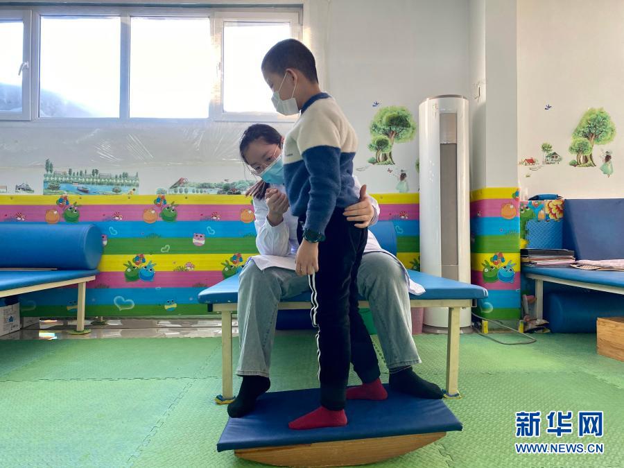 在哈爾濱博能中醫(yī)門診部,劉雨晴為腦癱兒童進行康復(fù)訓(xùn)練(2月2日攝,手機照片)。