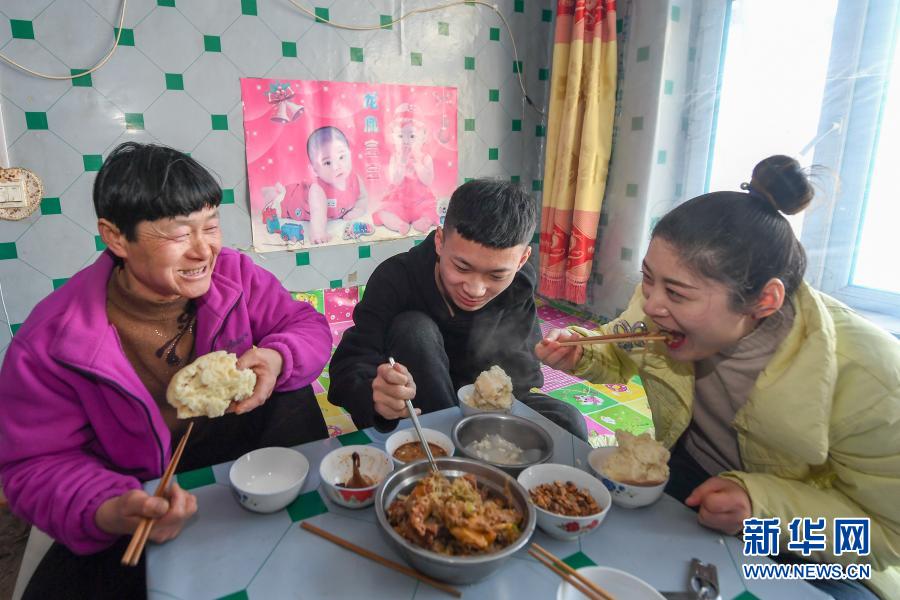 2月9日,在吉林省長(zhǎng)春市農(nóng)安縣楊樹(shù)林鄉(xiāng)牛尾巴山村,付寶印的母親鐘士輝(左)與付寶印的姐姐付寶賀(右)、外甥趙天寶(中)吃飯。新華社記者 張楠 攝
