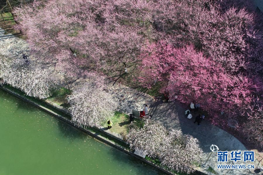 2月14日,在湖南省湘西土家族苗族自治州吉首大學,市民在梅園里賞花(無人機照片)。新華社發(fā)(彭彪 攝)