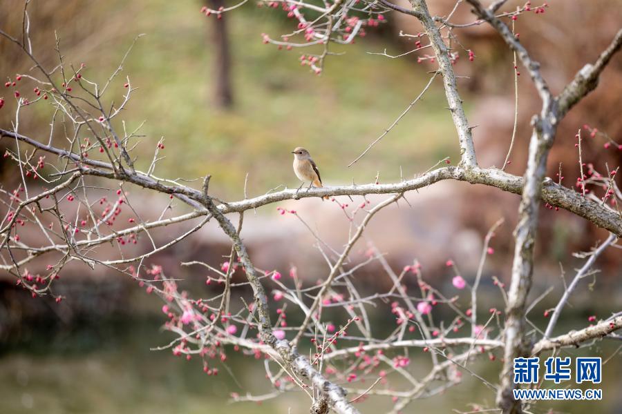 2月14日,在江蘇揚(yáng)州瘦西湖湖畔,一只小鳥在梅枝上停歇。新華社發(fā)(齊立廣 攝)
