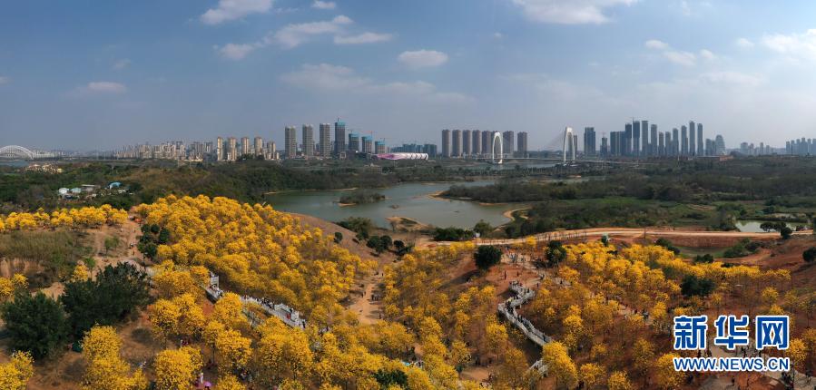 近日,廣西南寧市青秀山風(fēng)景區(qū)黃花風(fēng)鈴木盛放,吸引眾多游人前來(lái)觀賞。