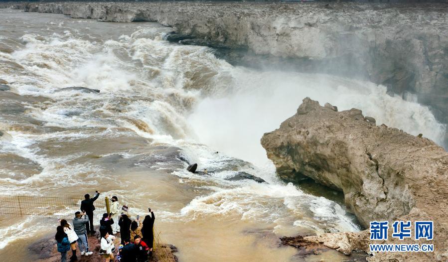 從2月24日起,陜西壺口瀑布景區(qū)恢復(fù)對外開放。隨著氣溫回升,黃河上游冰雪消融,水量增大,壺口瀑布的主瀑布恢復(fù)了往日奔騰咆哮的氣勢,黃河之水奔騰而下,形成壯觀瀑布群。