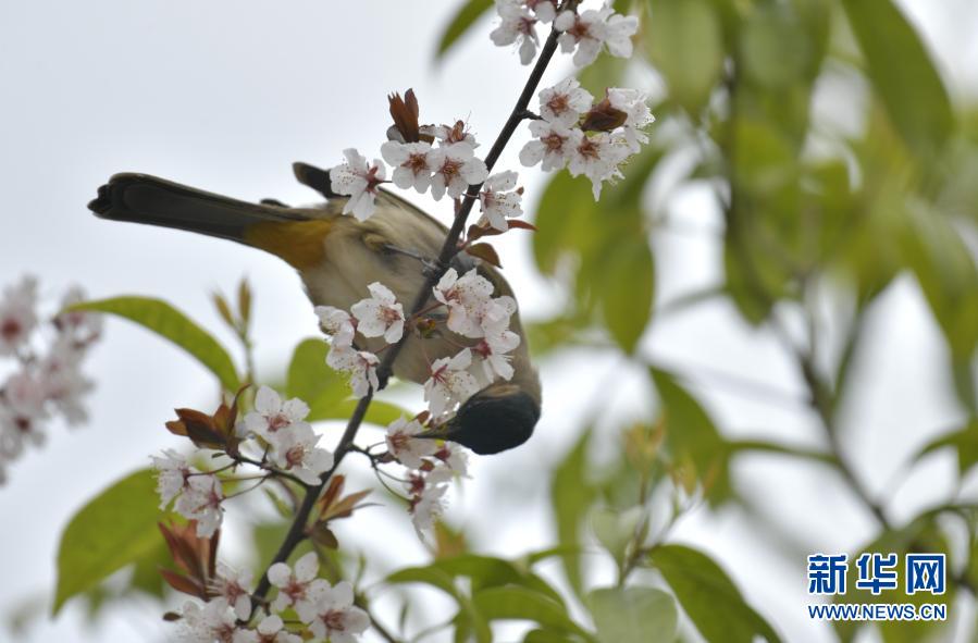 3月2日,在湖北省恩施土家族苗族自治州宣恩縣貢水河國(guó)家濕地公園,一只黃臀鵯在花枝上停留。新華社發(fā)(宋文 攝)