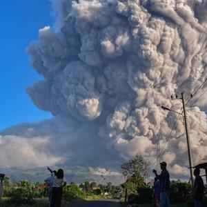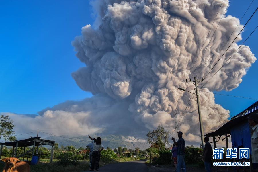 3月2日,人們?cè)谟《饶嵛鱽啽碧K門答臘省卡羅觀看噴發(fā)的錫納朋火山。新華社發(fā)(森比林?jǐn)z)