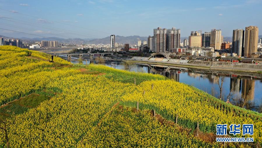 3月3日,漢江之濱安康市區(qū)的山坡上開滿油菜花(無人機(jī)照片)。新華社記者 陶明 攝