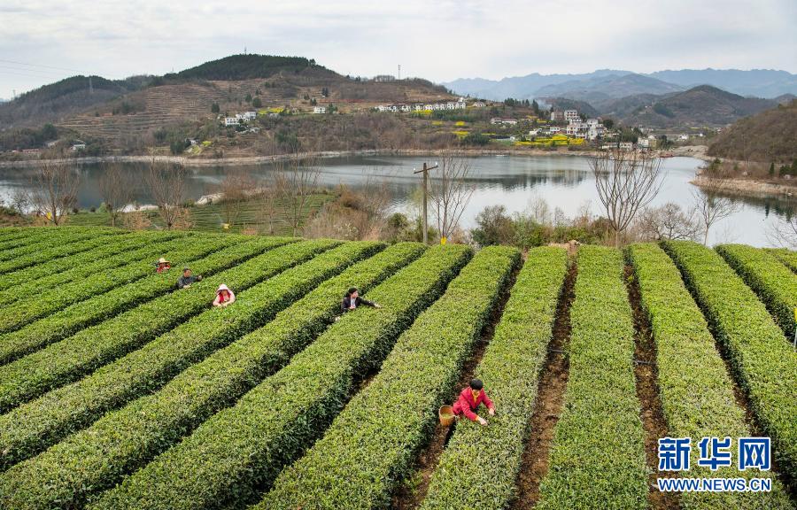 3月4日,茶農(nóng)在安康市漢濱區(qū)流水鎮(zhèn)剛子茶葉專業(yè)合作社標(biāo)準(zhǔn)化茶園采摘新茶(無人機(jī)照片)。新華社記者 陶明 攝