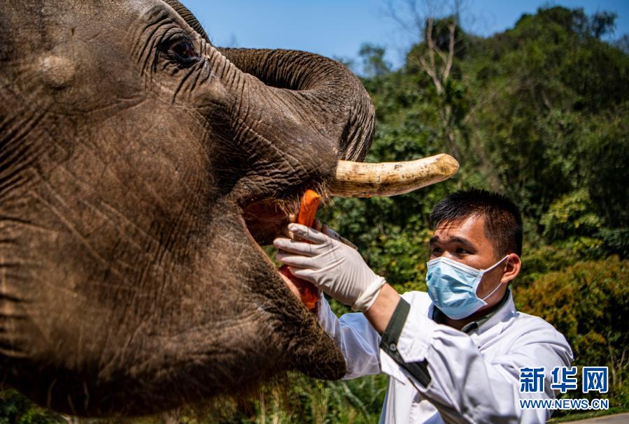 “象爸爸”為一頭名叫“小強”的大象檢查口腔(3月6日攝)。新華社記者 江文耀 攝
