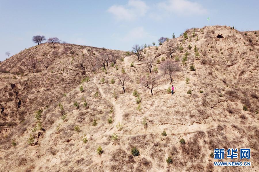 3月11日,在平?jīng)鍪嗅轻紖^(qū)白水鎮(zhèn)焦莊村北山,張文玉在山坡上查看栽植的油松(無(wú)人機(jī)照片)。