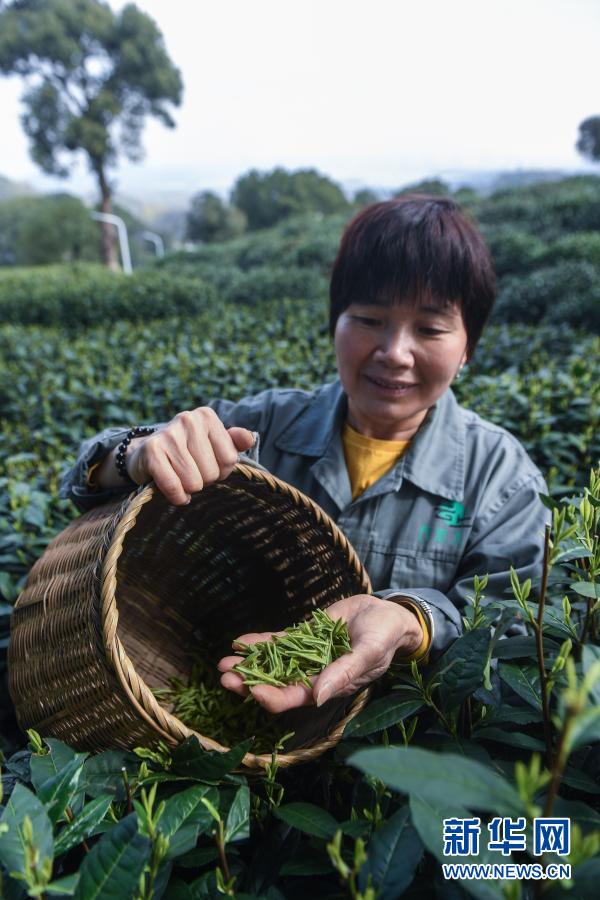 3月12日,在位于杭州市西湖風景名勝區(qū)滿覺隴村白鶴峰的西湖龍井茶葉基地,茶農展示剛剛采摘的西湖龍井茶鮮葉。