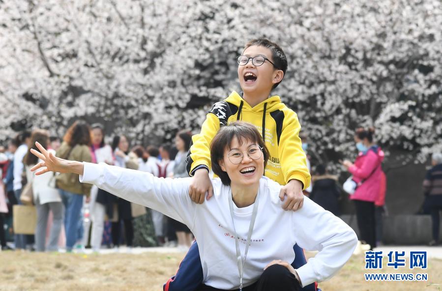 3月13日,廣東援鄂醫(yī)療隊成員梁仕鳳帶著孩子來到武漢大學賞櫻游玩。新華社記者 程敏 攝