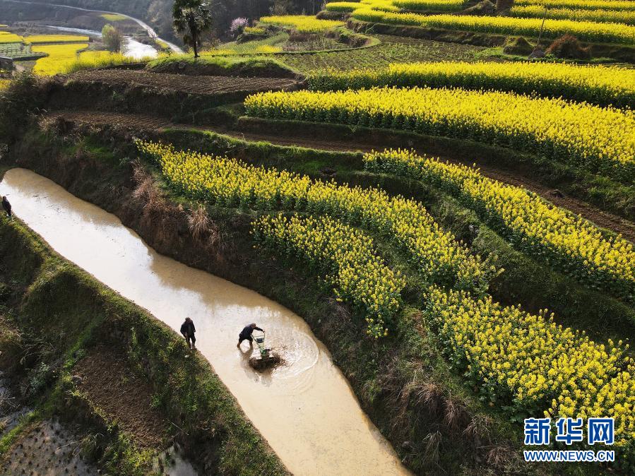 3月13日,在遵義市余慶縣白泥鎮(zhèn)民同村,村民在田間勞作(無人機(jī)照片)。新華社發(fā)(穆明飛 攝)