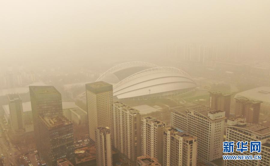 這是3月15日拍攝的遼寧省沈陽市奧體中心體育場(無人機(jī)照片)。當(dāng)日,我國北方多地出現(xiàn)沙塵天氣。新華社記者 楊青 攝