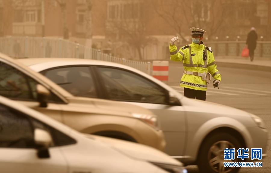 3月15日,交警在天津市南開區(qū)道路上執(zhí)勤。當(dāng)日,我國北方多地出現(xiàn)沙塵天氣。新華社記者 李然 攝