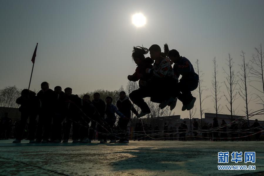 騎路小學(xué)的學(xué)生們在大課間練習(xí)“大網(wǎng)繩跳”(3月10日攝)。