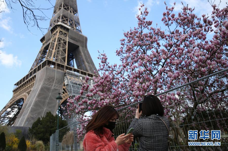 3月19日,在法國巴黎埃菲爾鐵塔腳下的戰(zhàn)神廣場,人們駐足欣賞玉蘭花。新華社記者高靜攝