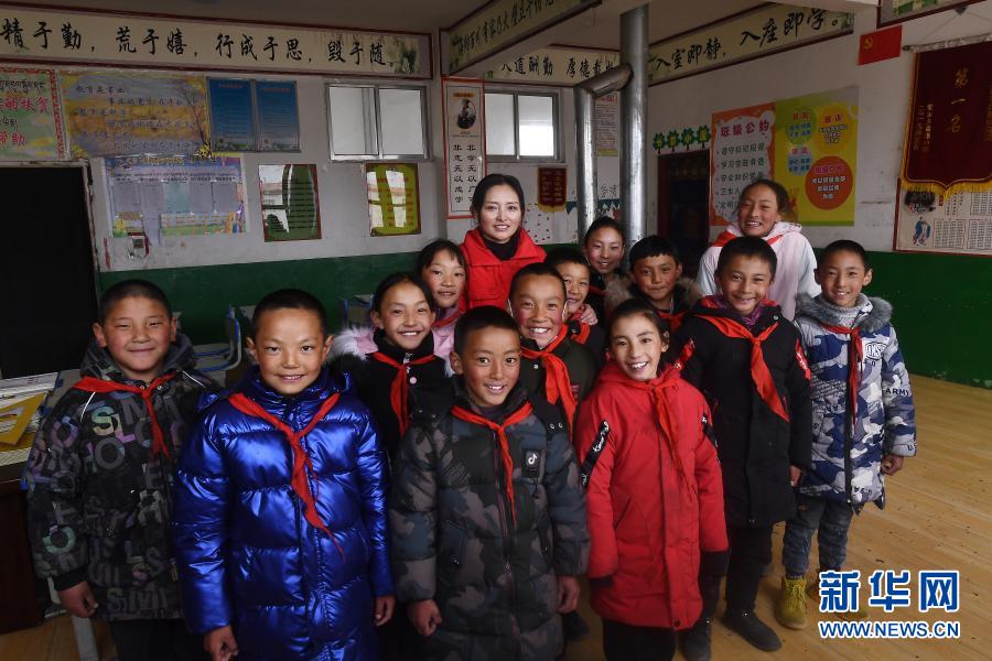3月16日,在索加鄉(xiāng)寄宿小學(xué),卓瑪才吉老師(后排中)和學(xué)生在一起。新華社記者 張宏祥 攝
