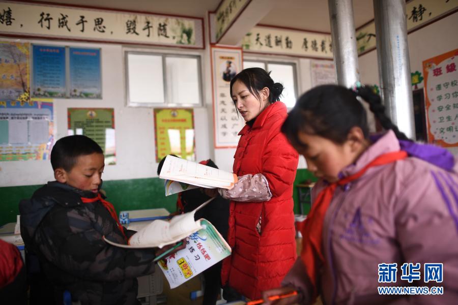 3月16日,索加鄉(xiāng)寄宿小學數(shù)學老師卓瑪才吉(左二)在課后輔導(dǎo)學生功課。新華社記者 駱曉飛 攝