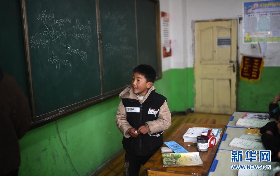 3月16日,索加鄉(xiāng)寄宿小學(xué)學(xué)生尕瑪桑丁在藏語文課上。新華社記者 張宏祥 攝