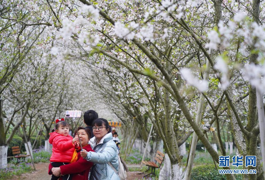 3月20日,游人在江西省南昌縣鳳凰溝景區(qū)櫻花谷拍照留念。