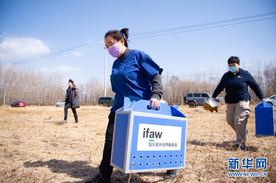 3月20日,北京猛禽救助中心猛禽康復(fù)師戴暢(中)和周蕾(右)將裝有大鵟的猛禽運輸箱運至放飛場地。