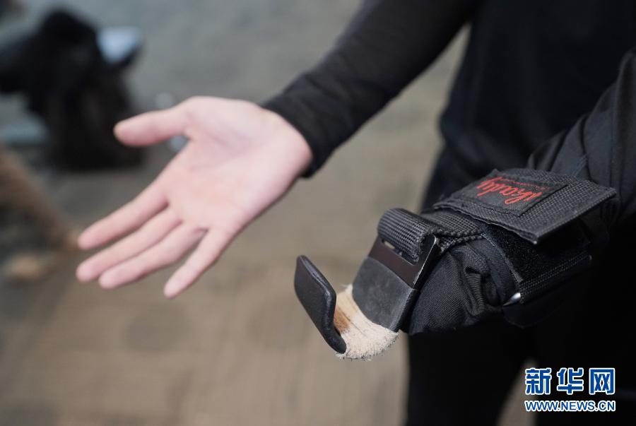 3月19日,冬殘奧會(huì)國(guó)家集訓(xùn)隊(duì)單板滑雪運(yùn)動(dòng)員紀(jì)立家在運(yùn)動(dòng)員駐地進(jìn)行體能訓(xùn)練時(shí)展示他穿戴的俗名“鉤子”的輔助器械。新華社記者 才揚(yáng) 攝