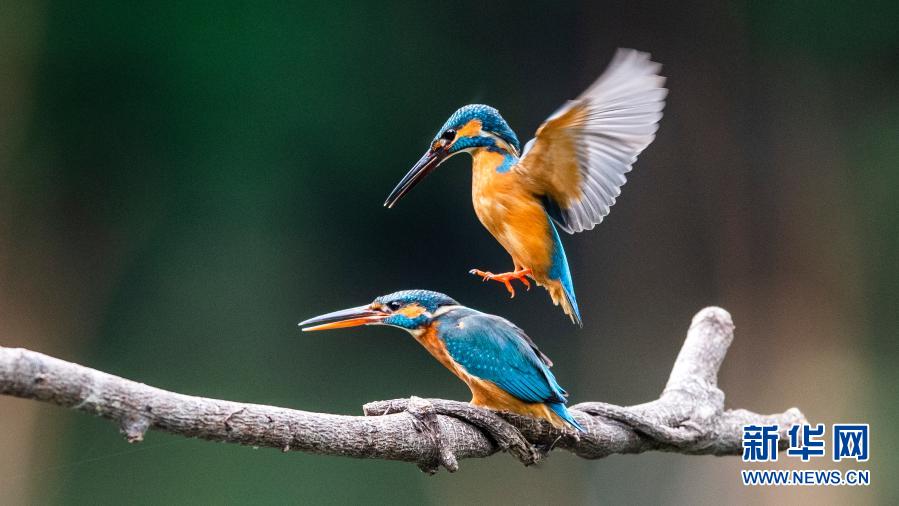 3月22日,在福州西湖公園的荷塘一角,兩只翠鳥(niǎo)在水邊的樹(shù)枝上嬉戲。