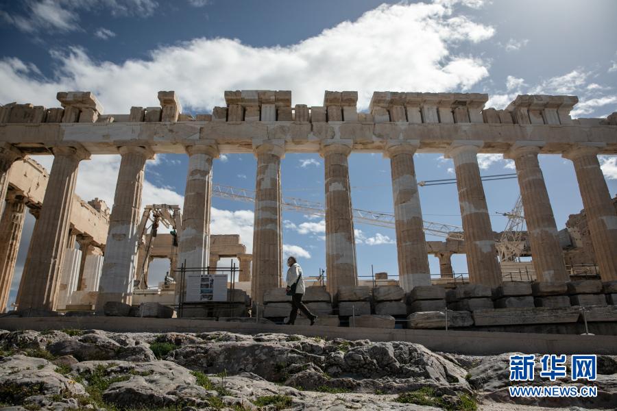 3月22日,一名游客游覽希臘雅典衛(wèi)城。希臘露天考古遺跡22日起恢復(fù)開放。游客需遵守保持社交距離和佩戴口罩等防疫規(guī)定。新華社發(fā)(萊夫特里斯·帕察里斯攝)