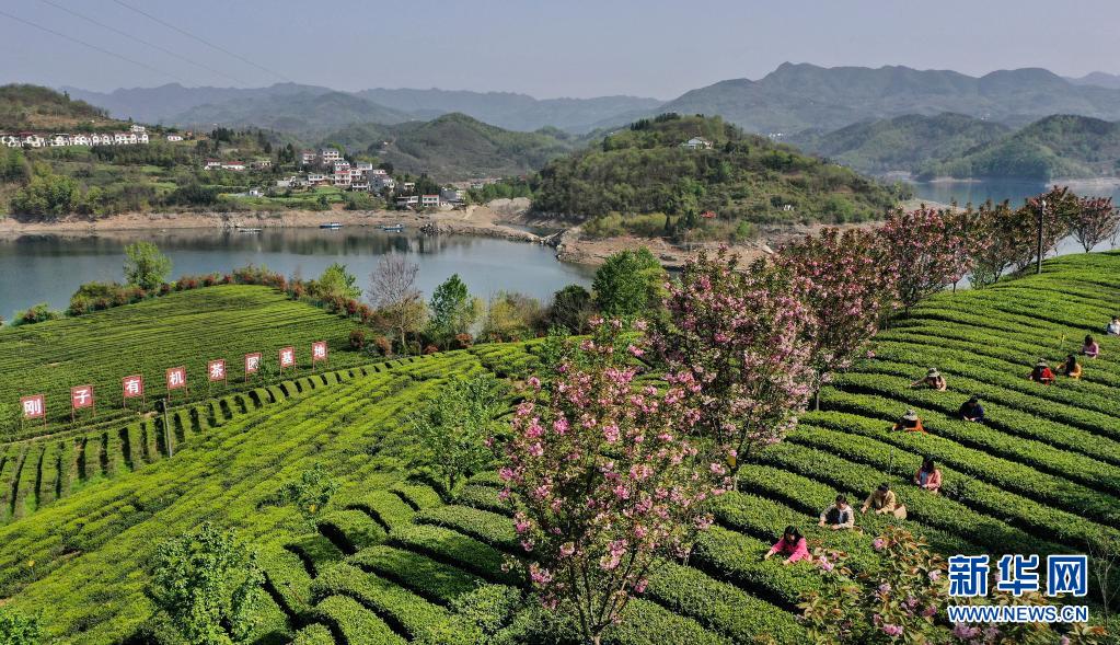 3月28日,流水鎮(zhèn)剛子茶葉專業(yè)合作社的社員在采摘新茶(無人機照片)。