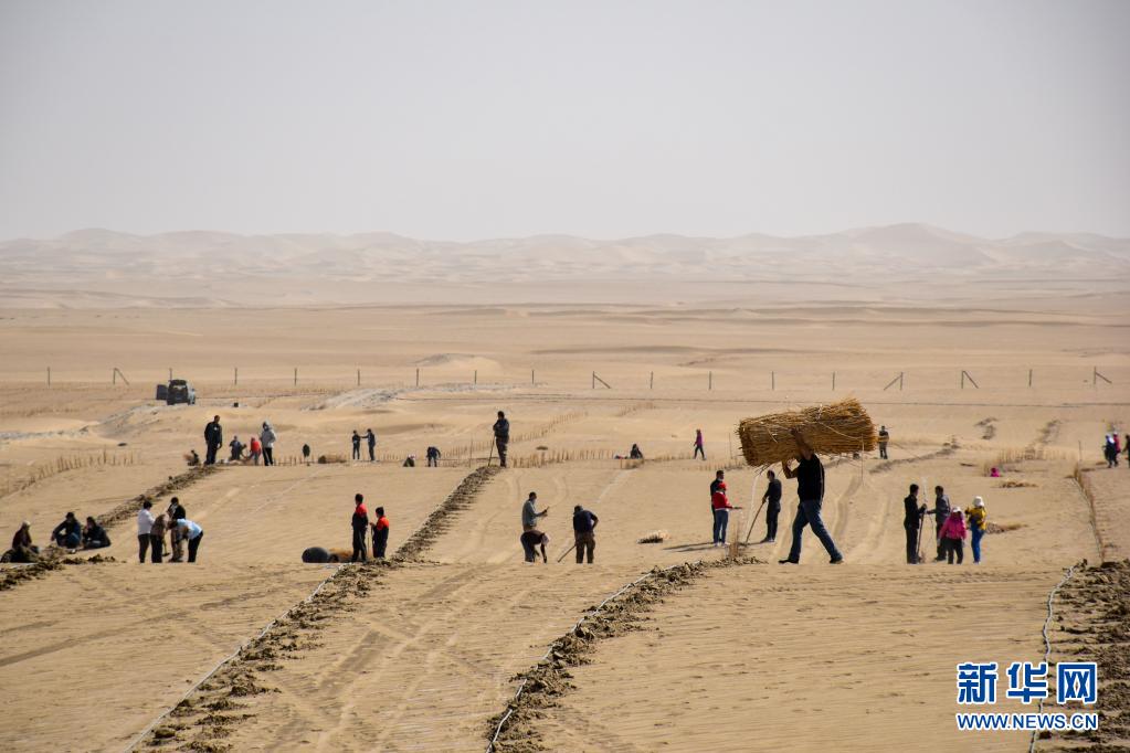 3月28日,人們?cè)谇夷┛h城不遠(yuǎn)處的塔克拉瑪干沙漠內(nèi)植樹。
