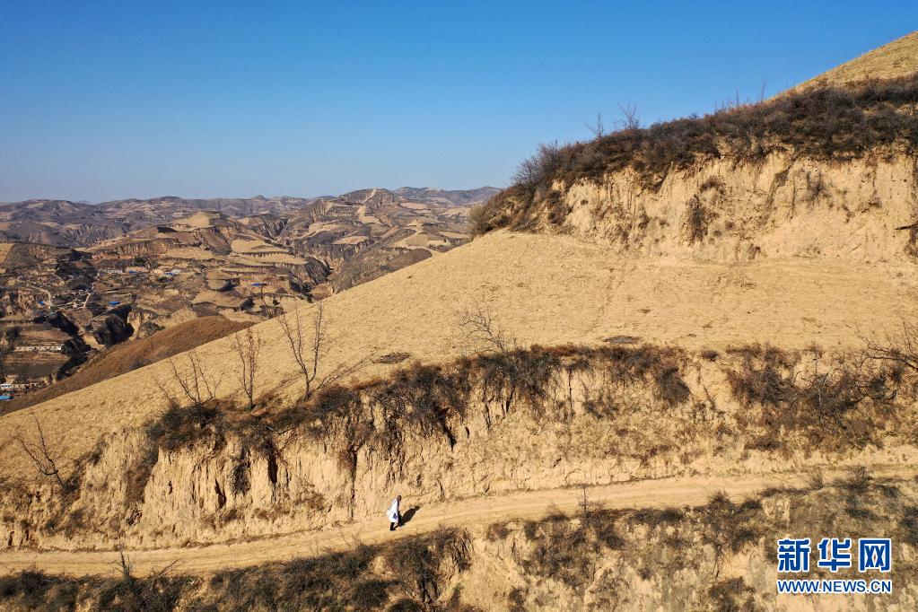 山西省石樓縣鐵頭村的村醫(yī)張尚保走在出診的山路上(3月23日攝,無(wú)人機(jī)照片)。新華社記者 詹彥 攝