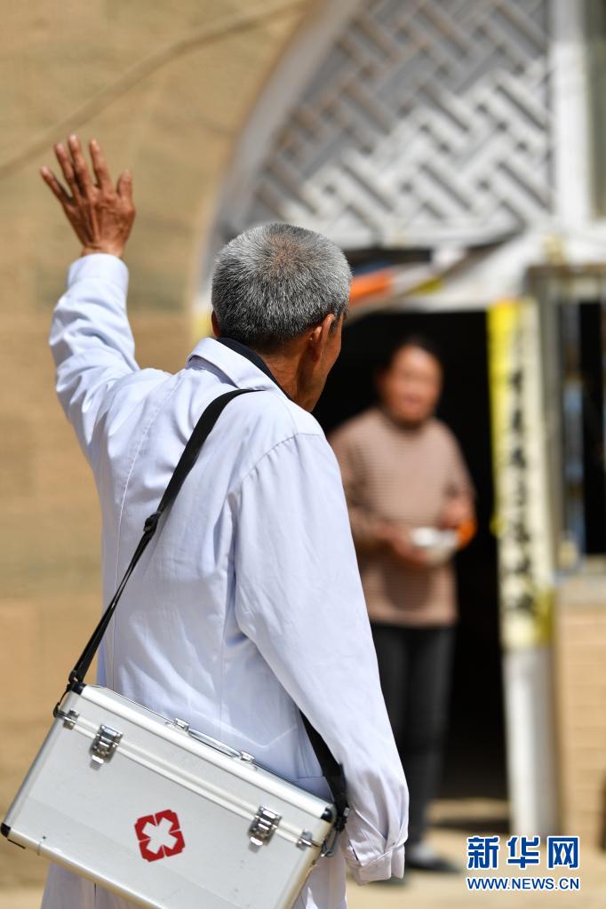 在山西省石樓縣鐵頭村下鐵頭自然村,出診結(jié)束后的張尚保和村民揮手告別(3月24日攝)。新華社記者 詹彥 攝