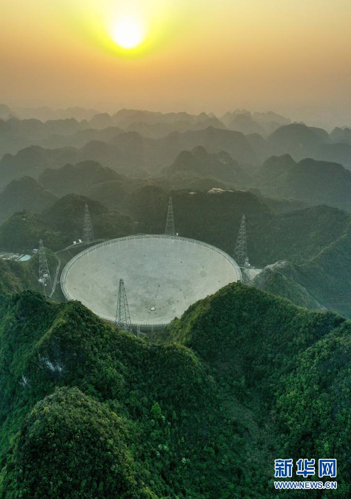 3月29日拍攝的晚霞中的“中國天眼”全景(維護保養(yǎng)期間拍攝,無人機照片)。