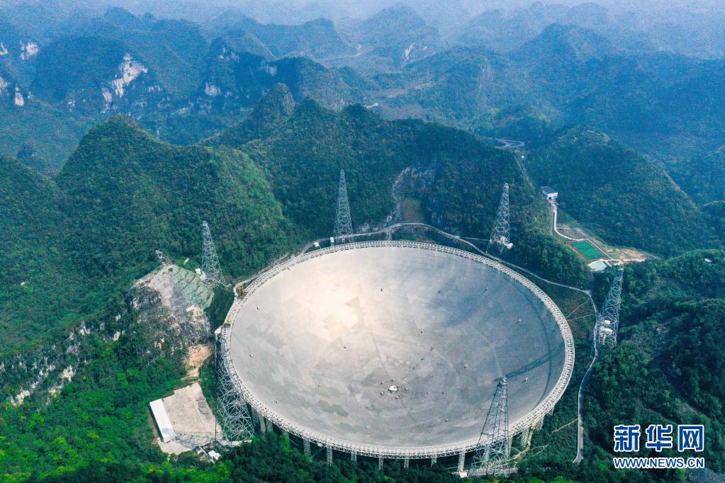 在貴州省平塘縣,被譽為“中國天眼”的500米口徑球面射電望遠鏡(FAST)在群山中仰望星空,探求著宇宙奧秘。