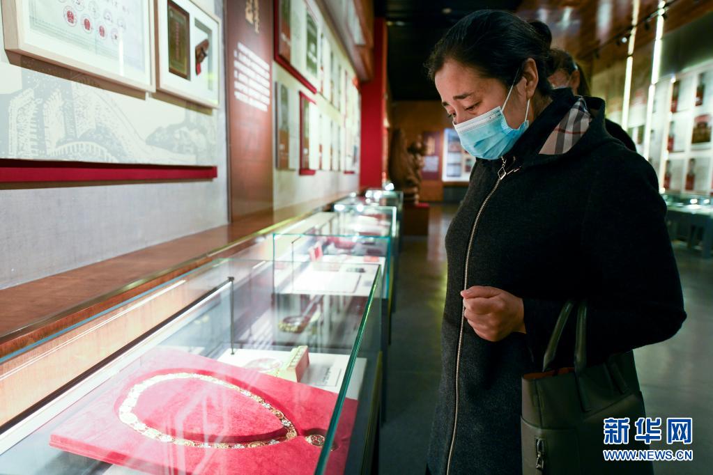 4月3日,在烏魯木齊市革命烈士陵園,瑪依努爾看著艾熱提的獎?wù)孪萑肷钏肌?/p>