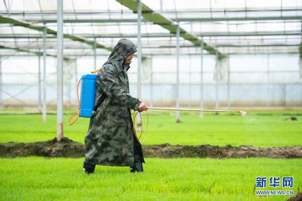 4月5日,在湖南省瀏陽(yáng)市龍伏鎮(zhèn)鼎鈞種養(yǎng)專業(yè)合作聯(lián)合社水稻育秧工廠,工作人員給秧苗施肥。